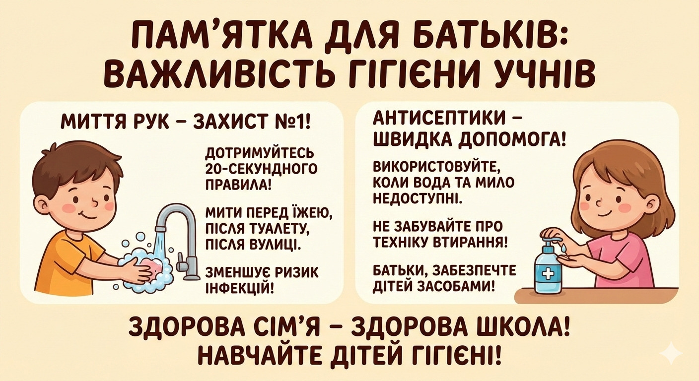 Шановні батьки! Здоров’я учнів та безпека всього класу починаються з простих звичок. Чисті руки — це найефективніший спосіб зупинити поширення вірусів та бактерій.