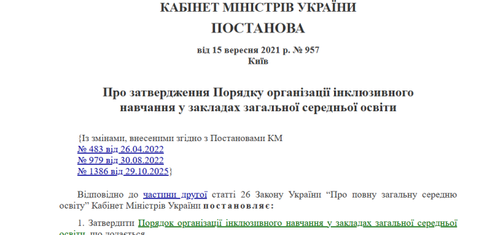 0 Постанова КМУ від 15 вересня 2021 року №957 “Про затвердження Порядку організації інклюзивного навчання у закладах загальної середньої освіти” 1 Вер, 2025