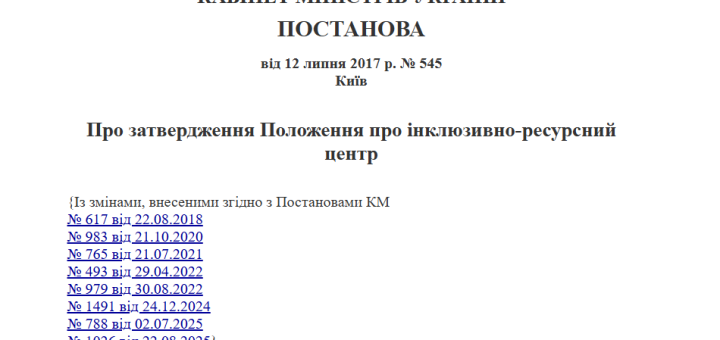 0 Постанова КМУ від 12 липня 2017 р. № 545 “Про затвердження Положення про інклюзивно-ресурсний центр” 1 Вер, 2025