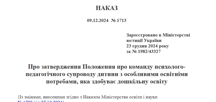 0 Наказ МОН України від 09.12.2024 № 1713 “Про затвердження Положення про команду психолого-педагогічного супроводу дитини з особливими освітніми потребами, яка здобуває дошкільну освіту” 1 Вер, 2025
